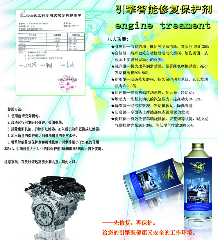 "Weiling"Intelligent repairment protective agent, the U.S. nano-technology, nano-magnetic single-molecule latest environmentally friendly energy research, scientific tests by China Petroleum & Chemical identified as cutting-edge high-tech cleaning maintenance products.. Intelligent agents embedded engine repair smart repair protection factor, wear and tear can quickly repair, recovery cylinder pressure; reduce noise and reduce wear and tear, lower fuel consumption; inhibit the old oil burning vehicles, take the blue smoke and other phenomena; increased power, acceleration, prolong engine life; specially formulated for gasoline (diesel) engines.
