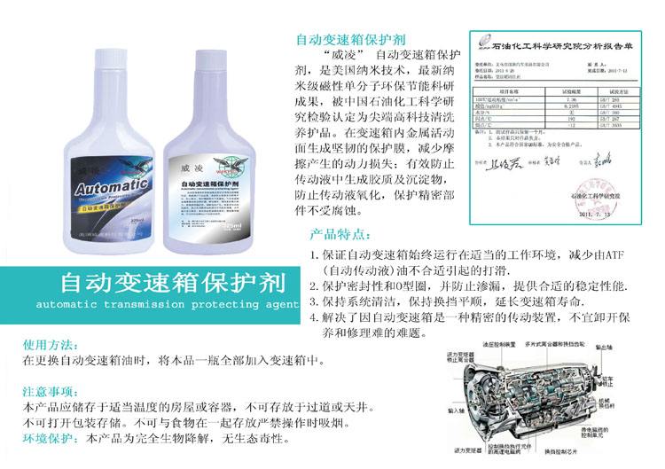 "Weiling"Automatic transmission protective agent, the U.S. nano-technology, nano-magnetic single-molecule latest environmentally friendly energy research, scientific tests by China Petroleum & Chemical identified as cutting-edge high-tech cleaning maintenance products. Activities within the surface of the metal in the gearbox to generate tough protective film to reduce friction loss of power; prevent transmission fluid to generate glial and sediment, to prevent the transmission fluid oxidation, protecting precision components from corrosion.